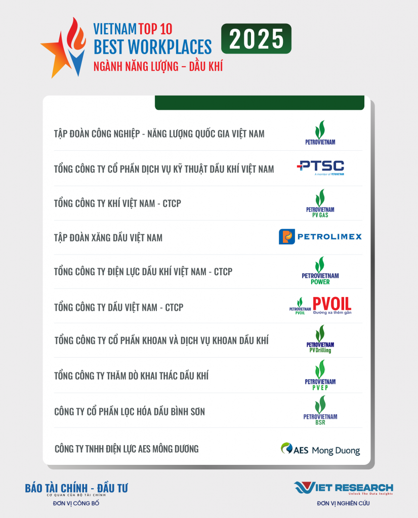 CÔNG BỐ TOP 10 NƠI LÀM VIỆC TỐT NHẤT VIỆT NAM – NGÀNH NĂNG LƯỢNG – DẦU KHÍ