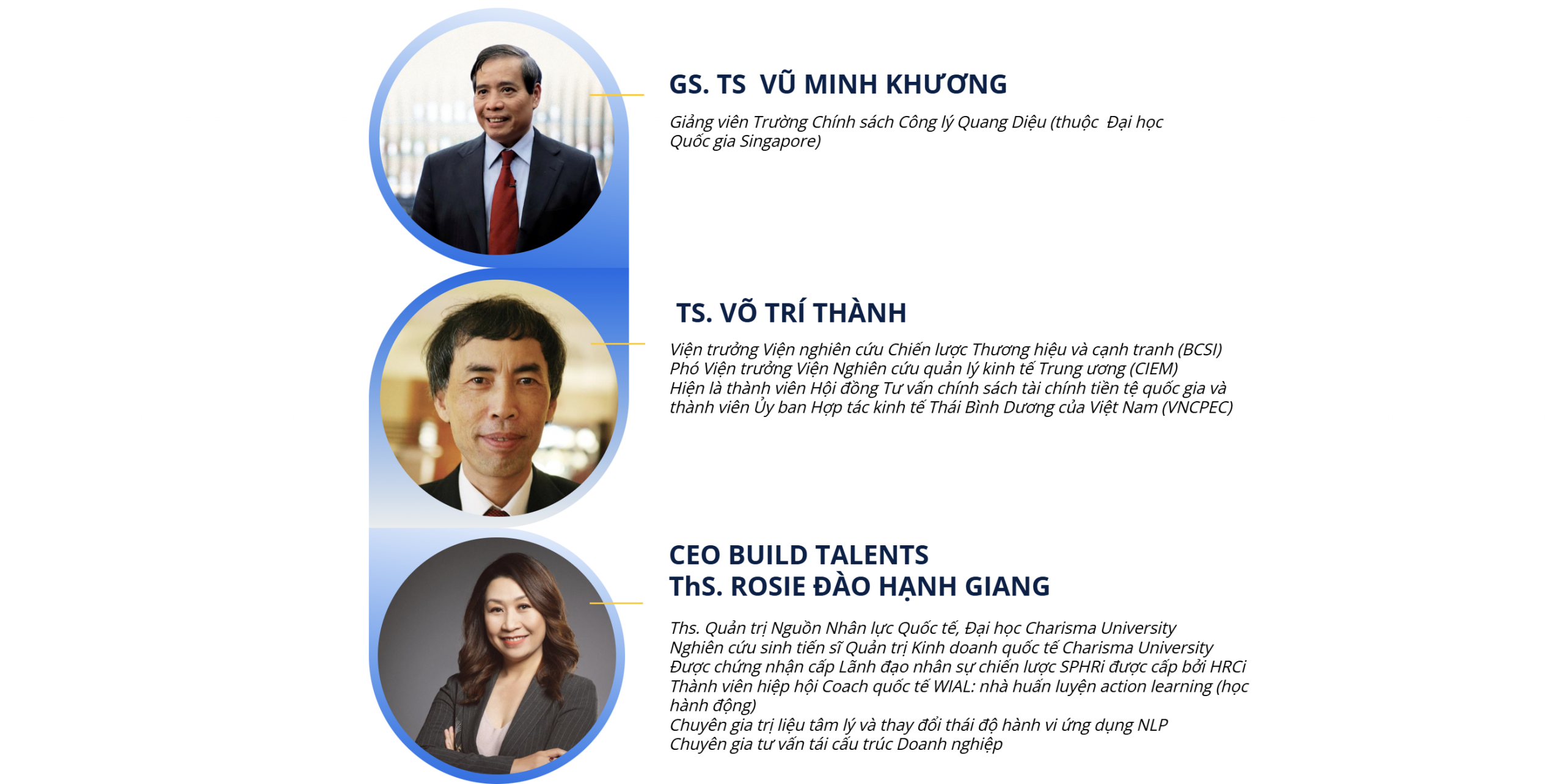 Buổi webinar có sự tham gia của ba diễn giả uy tín trong lĩnh vực nhân sự và kinh tế: GS. TS. Vũ Minh Khương (ĐH Quốc gia Singapore), TS. Võ Trí Thành (Viện trưởng Viện Nghiên cứu Chiến lược Thương hiệu & Cạnh tranh) và bà Rosie Đào Hạnh Giang (CEO Build Talents).