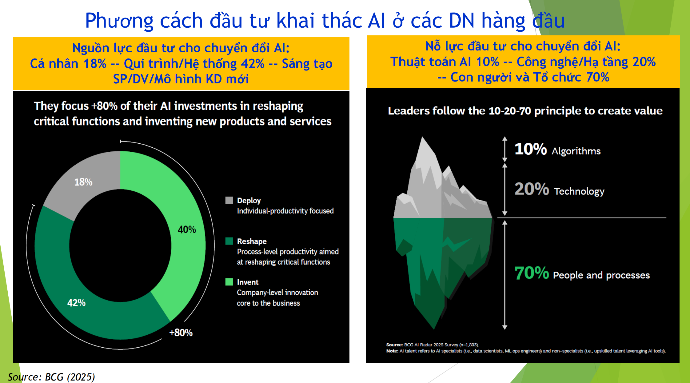 Xuyên suốt buổi hội thảo, diễn giả đã nhấn mạnh rằng AI và công nghệ số đang thay đổi căn bản phương thức vận hành của doanh nghiệp toàn cầu. Không chỉ dừng lại ở việc cắt giảm chi phí hay nâng cao năng suất, công nghệ này còn mở ra một cách tiếp cận hoàn toàn mới trong việc quản trị con người và xây dựng văn hóa tổ chức. Tại Việt Nam, ước tính của CTO FPT cho thấy doanh nghiệp có thể tiết kiệm tới 50% chi phí và tăng 67% năng suất nếu triển khai AI một cách toàn diện. Song, các chuyên gia cũng lưu ý rằng giá trị dài hạn chỉ đạt được khi công nghệ đi đôi với chiến lược phát triển con người, thay vì chỉ tập trung vào lợi ích ngắn hạn. Trong bài tham luận tại webinar, GS.TS Vũ Minh Khương nhấn mạnh rằng AI không chỉ là công cụ hỗ trợ, mà đã trở thành nền tảng nâng tầm tầm nhìn chiến lược và hiệu lực lãnh đạo của doanh nghiệp Việt Nam. Theo ông, AI đang mở ra ba chuyển động lớn: sự gián đoạn (disruption) trong mô hình kinh doanh truyền thống, khả năng phát kiến vượt bậc (discovery), và kỷ nguyên mới (dawn) nơi cả doanh nghiệp lẫn cá nhân đều có thể tạo đột phá. Ông chỉ ra bảy kênh AI có thể kiến tạo giá trị, từ năng lực cá nhân, hiệu quả lãnh đạo, năng suất vận hành, học hỏi và đổi mới, đến mở rộng thị trường, phát triển hệ sinh thái và tăng khả năng chống chịu. Ngành sữa Việt Nam được đưa ra như một ví dụ điển hình: AI giúp phân tích thị trường, minh bạch KPI, tối ưu chuỗi cung ứng và hỗ trợ ra quyết định, trong bối cảnh ngành vẫn còn hạn chế về tự động hóa và R&D. Để thành công, doanh nghiệp cần tuân thủ những nguyên tắc như tầm nhìn rõ ràng, khách hàng làm trung tâm, liên kết dữ liệu và đảm bảo liêm chính – an toàn – tuân thủ. Ông kết luận, 70% nỗ lực chuyển đổi AI nằm ở con người và tổ chức, khẳng định đầu tư vào nhân lực, sáng tạo và văn hóa mới chính là trụ cột quyết định thành công.