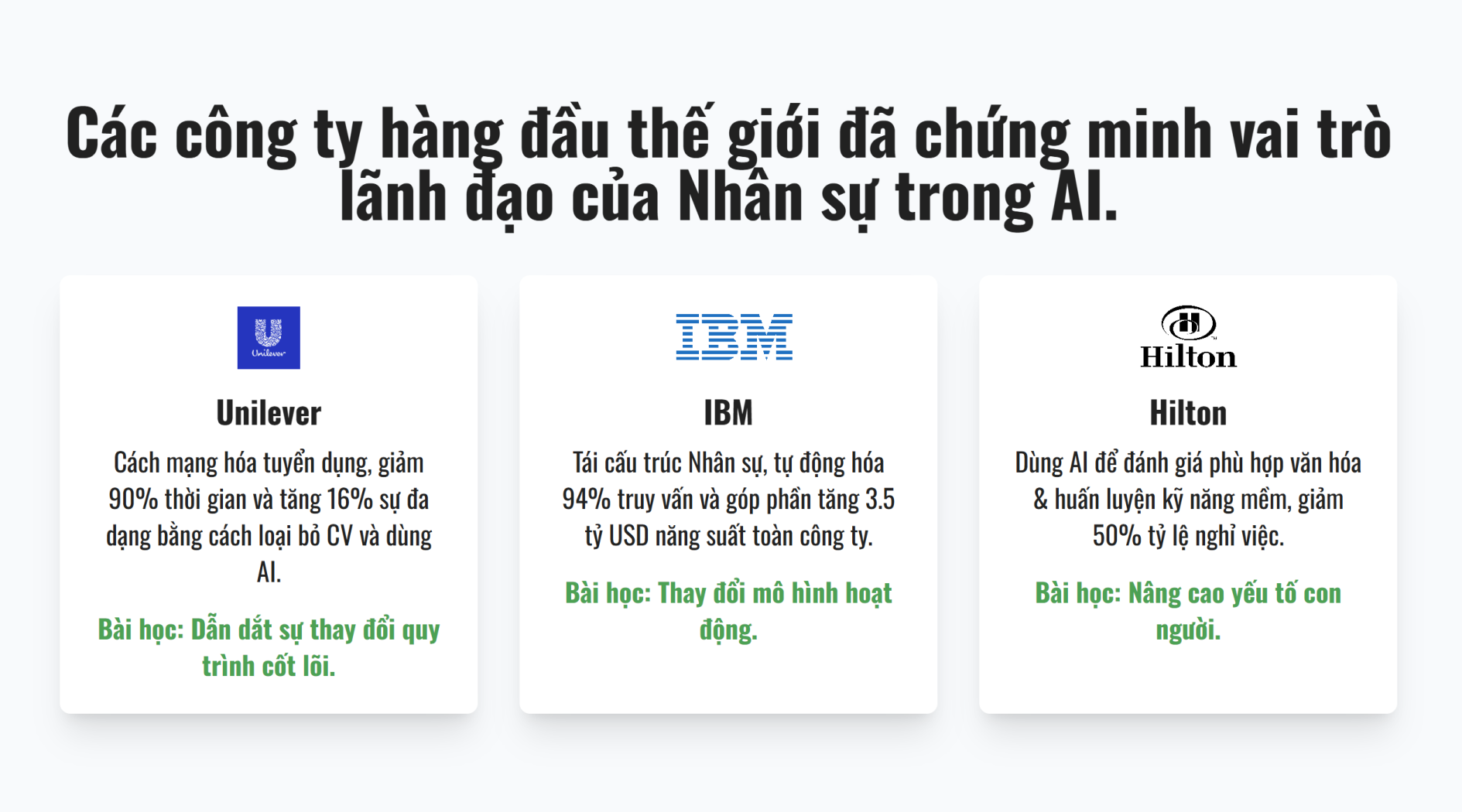 Những minh chứng từ thực tiễn doanh nghiệp toàn cầu càng củng cố cho luận điểm này. Một trong những case study được đề cập tới là rường hợp của Hilton – doanh nghiệp đã sử dụng AI để đánh giá mức độ phù hợp văn hóa và đào tạo kỹ năng mềm, qua đó giảm được 50% tỷ lệ nghỉ việc. Ở chiều ngược lại, những tổ chức thiếu chiến lược đồng bộ giữa công nghệ và nhân sự thường gặp rào cản lớn trong việc duy trì cam kết và lòng tin từ nhân viên. Điều này cho thấy, chỉ khi nhân sự chủ động kiến tạo văn hóa đổi mới và bảo đảm tính minh bạch trong sử dụng AI, doanh nghiệp mới có thể đạt được sự bền vững.