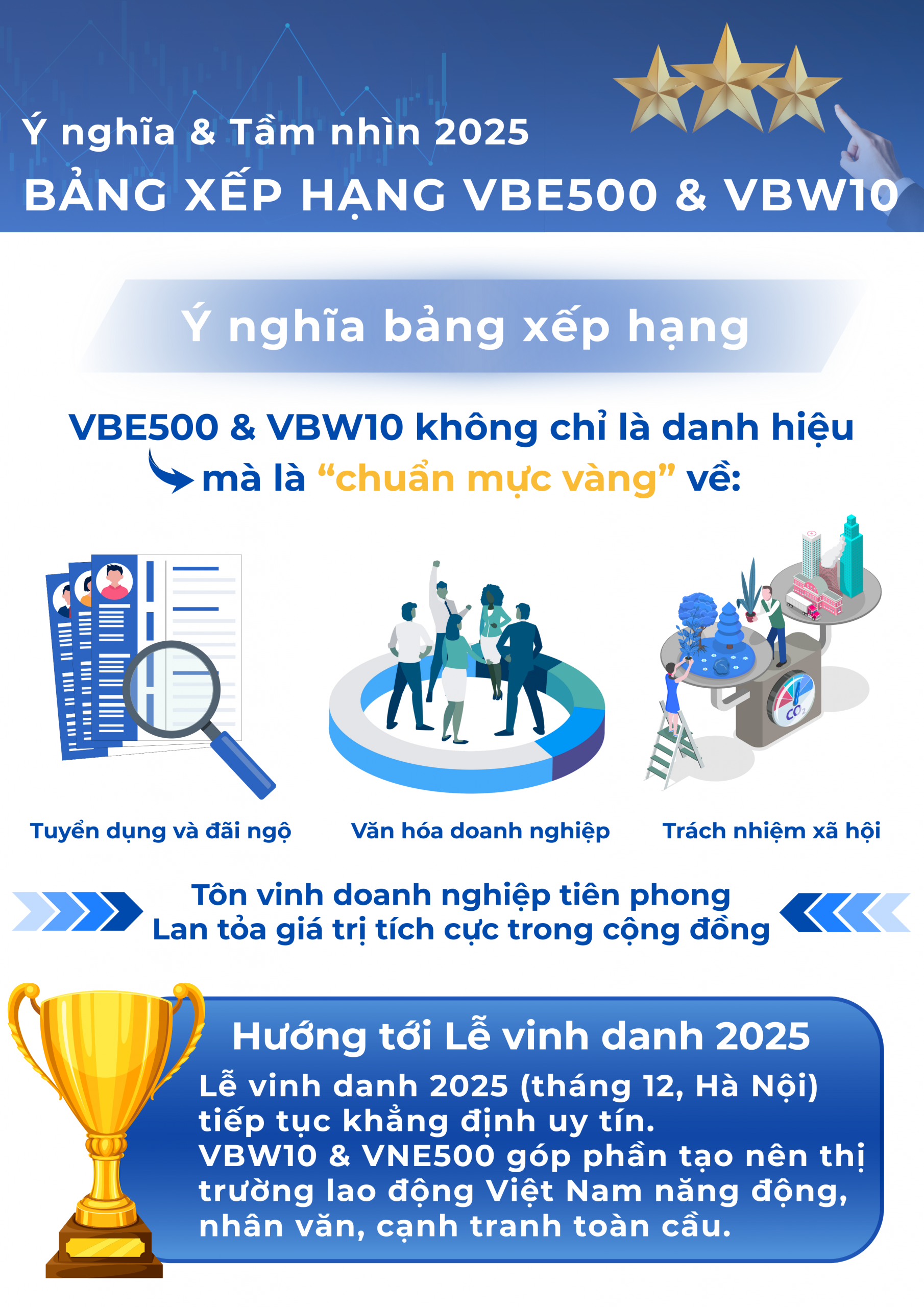 Việc dựa vào “nội lực” trở thành một nhiệm vụ chiến lược, và thị trường lao động chính là một trong những động lực cốt lõi nhất để kiến tạo sự thịnh vượng bền vững. Cũng vậy, sự cần thiết của các bảng xếp hạng uy tín như Top 500 Nhà tuyển dụng hàng đầu Việt Nam (VBE500) và Top 10 Nơi làm việc tốt nhất Việt Nam (VBW10) càng được khẳng định. Các bảng xếp hạng này không chỉ là danh hiệu, mà là kim chỉ nam giúp doanh nghiệp định vị và đầu tư đúng đắn vào con người, từ đó biến những thách thức trên thị trường thành lợi thế cạnh tranh bền vững.