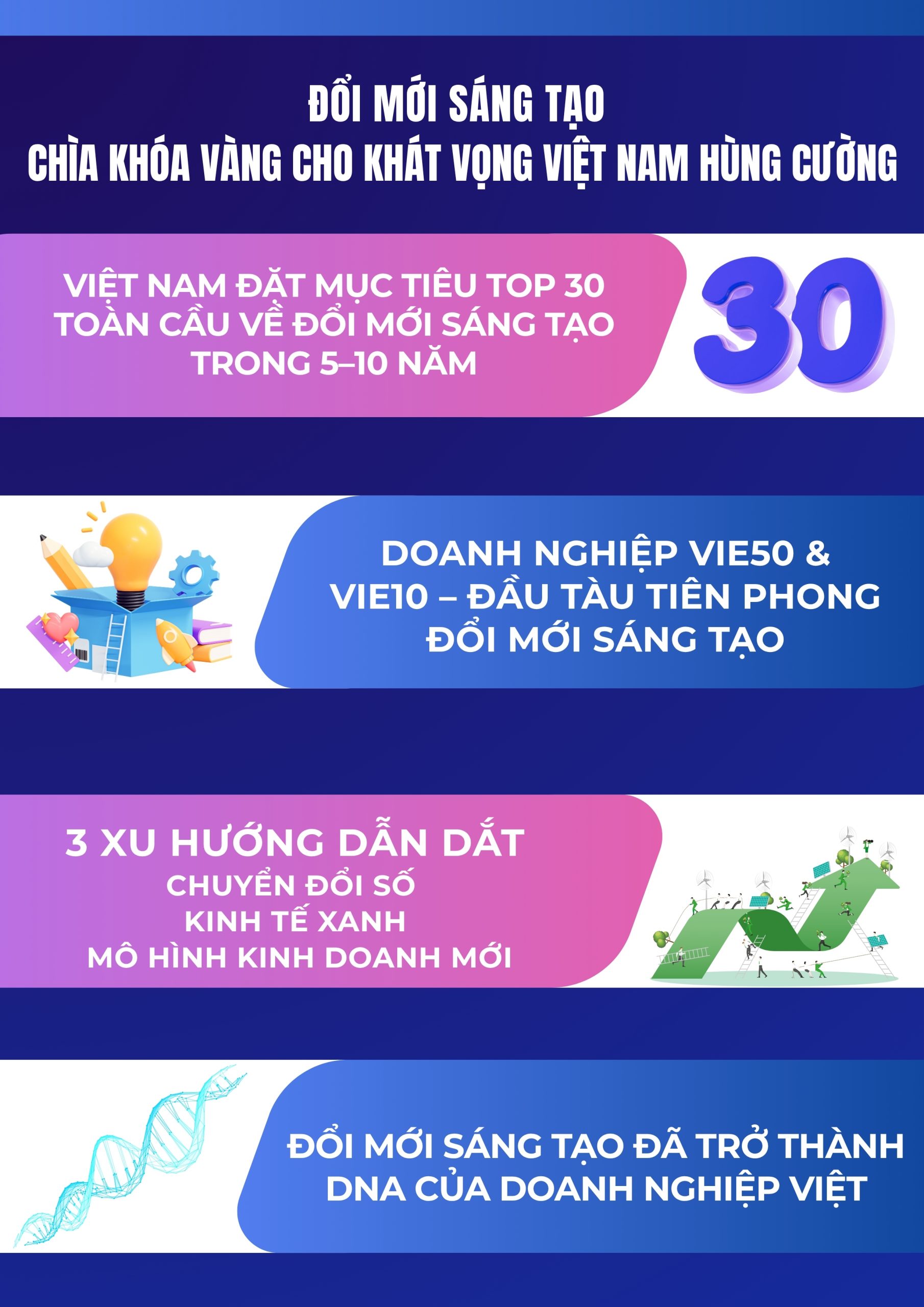 Đổi mới sáng tạo không còn là khái niệm xa xỉ, mà đã trở thành DNA của doanh nghiệp Việt Nam trong kỷ nguyên mới. Tinh thần tiên phong của cộng đồng doanh nghiệp VIE50 và VIE10 chính là hình ảnh thu nhỏ của khát vọng quốc gia: vươn tầm, bứt phá và kiến tạo tương lai. Và hơn hết, chính khát vọng đổi mới sáng tạo sẽ là ngọn lửa soi đường, đưa Việt Nam tiến bước vững chắc trên con đường trở thành một quốc gia hùng cường, thịnh vượng và đầy bản lĩnh trong thế kỷ XXI.