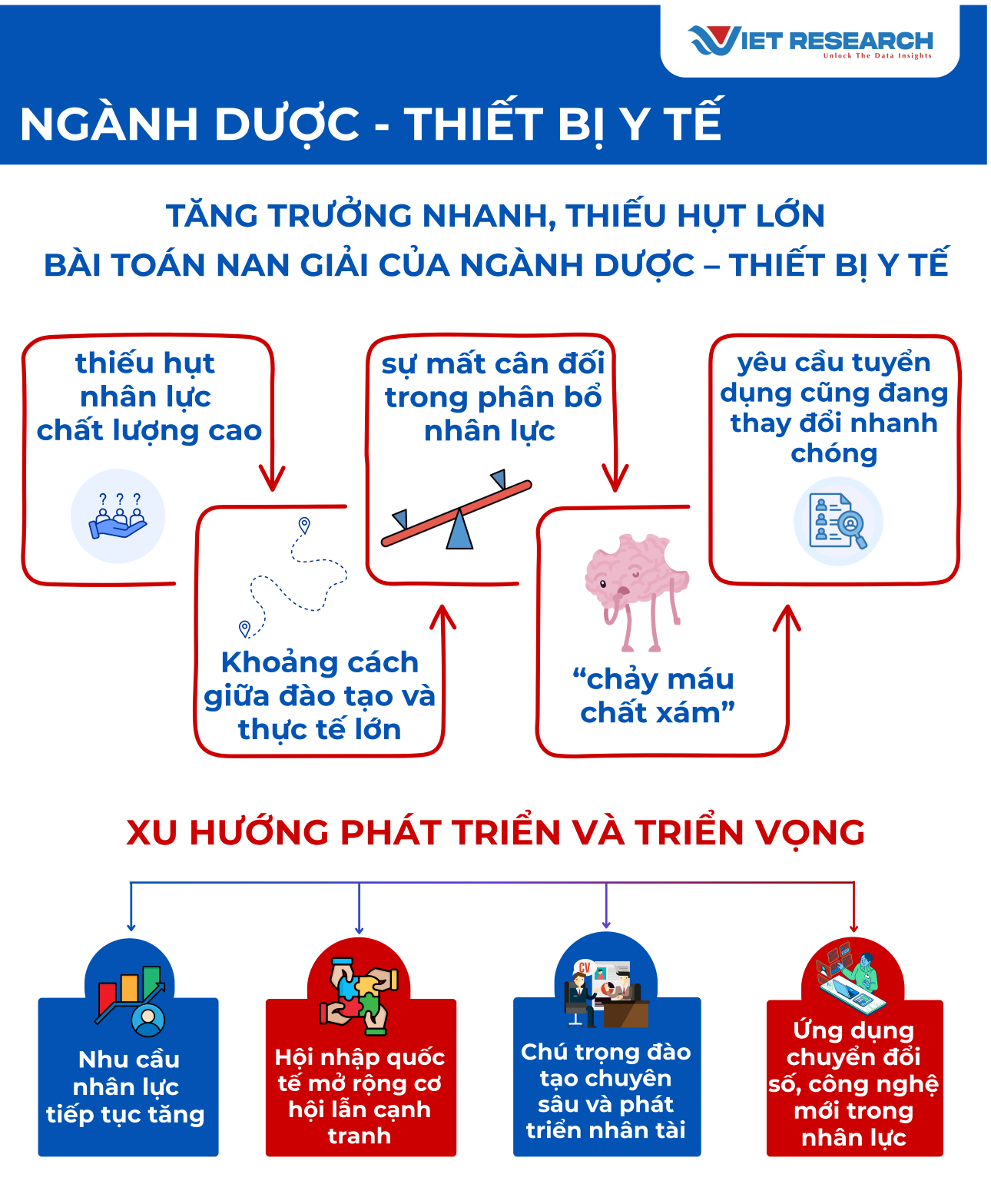 Mặc dù có nhiều tiềm năng, thị trường lao động ngành Dược – Thiết bị y tế Việt Nam hiện đang phải đối mặt với những thách thức mang tính cơ cấu sâu sắc, ảnh hưởng trực tiếp đến chất lượng và khả năng cạnh tranh của nguồn nhân lực. Nghiên cứu của Viet Research tại nhóm doanh nghiệp thuộc Top 10 Nơi làm việc tốt nhất Việt Nam – Ngành Dược – Thiết bị y tế cho thấy ngành đang phải xử lý 5 thách thức chính.