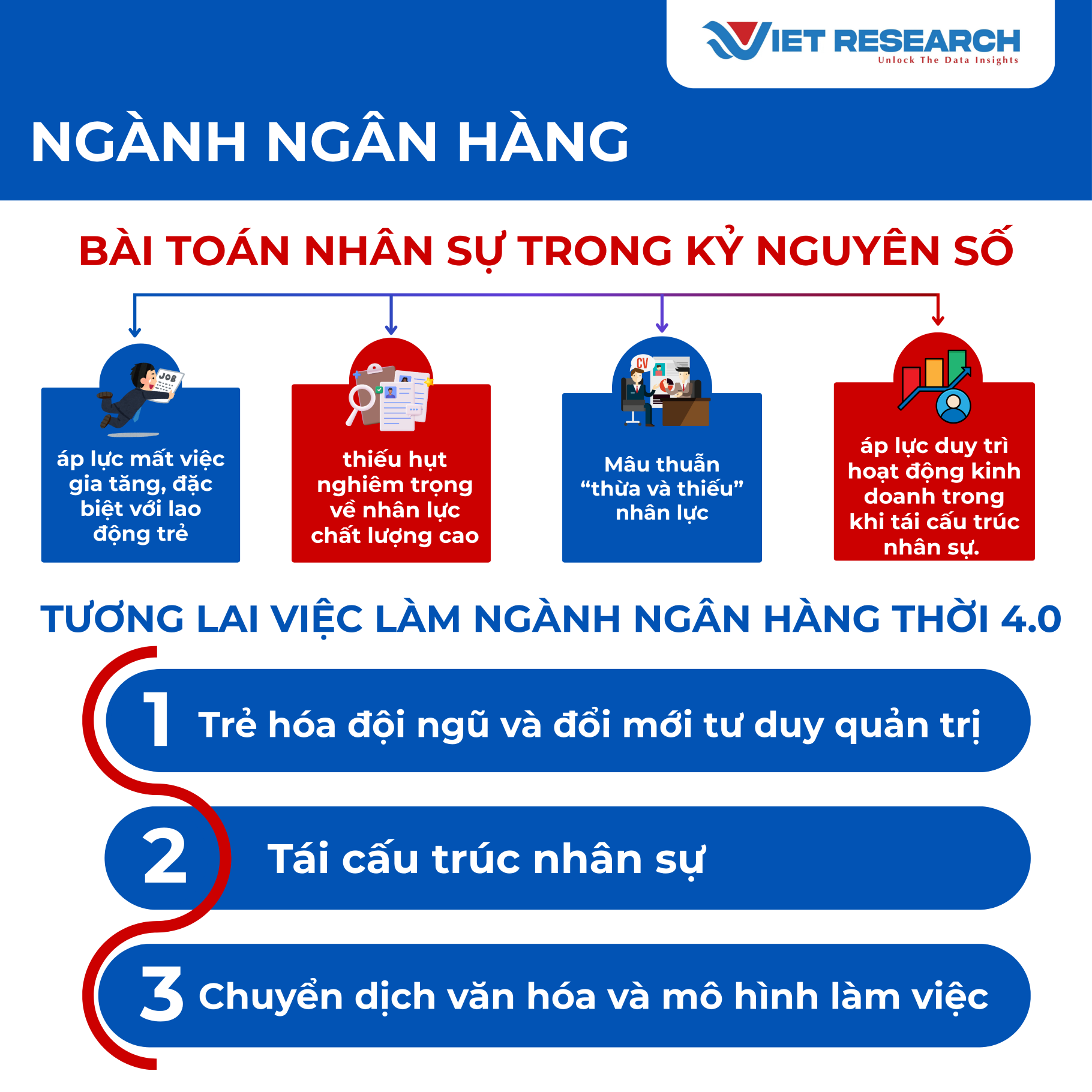 Dù hiện tại thị trường lao động ngân hàng đang trải qua nhiều biến động, bức tranh dài hạn vẫn mang nhiều gam màu tích cực nếu cả doanh nghiệp và người lao động biết chủ động thích ứng. Ngành Ngân hàng không “thu hẹp” như vẻ bề ngoài, mà đang tái định hình chiến lược nhân sự để phù hợp với kỷ nguyên 4.0 – giai đoạn mà công nghệ trở thành trụ cột vận hành mới. Theo khảo sát và nghiên cứu từ Top 10 Nơi làm việc tốt nhất Việt Nam – Ngành Ngân hàng của Viet Research, có 3 xu hướng lớn đang định hình diện mạo mới của lực lượng lao động ngành Ngân hàng trong giai đoạn tới.