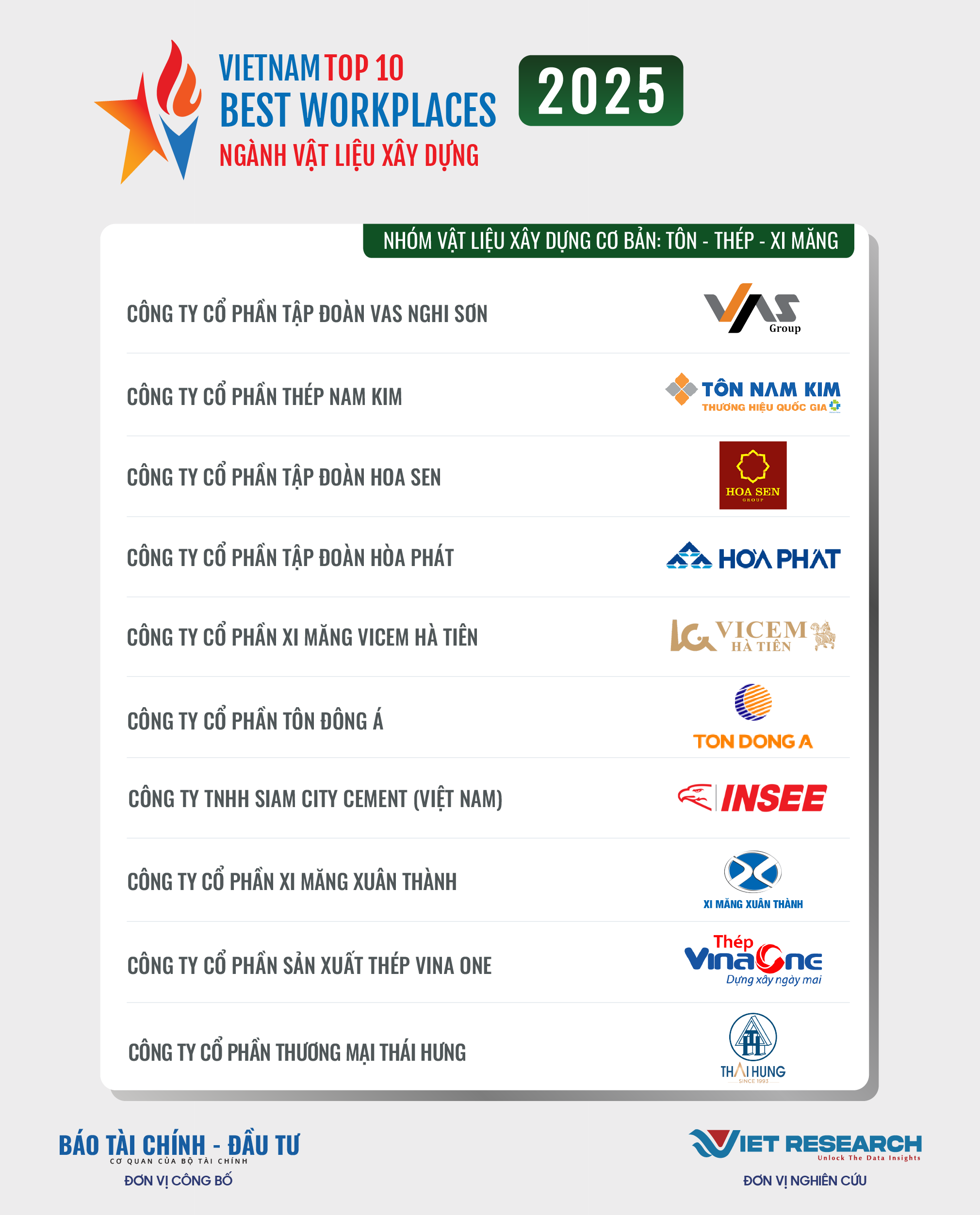 Nguồn: Top 10 Nơi làm việc tốt nhất Việt Nam – Ngành Vật liệu xây dựng (https://vbw10.vn/)