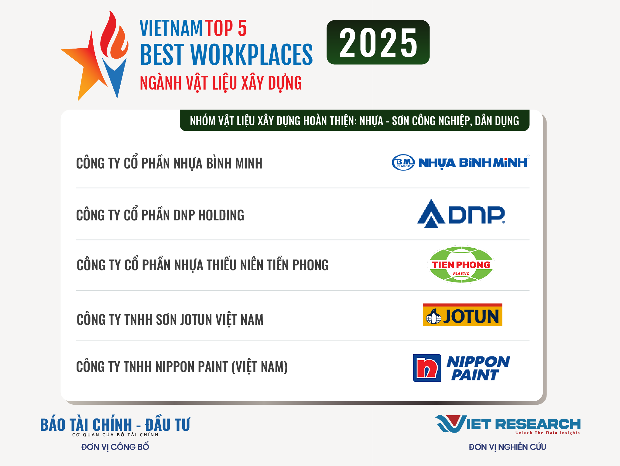 Năm 2025 là năm thứ tư liên tiếp Chương trình Top 10 Nơi làm việc tốt nhất Việt Nam – VBW10 trong các ngành kinh tế trọng điểm được Viet Research và Báo Tài chính – Đầu tư (Bộ Tài chính) nghiên cứu và công bố. Đây là chương trình thường niên nhằm tìm kiếm và tôn vinh những doanh nghiệp có môi trường làm việc tốt nhất trong các ngành, các doanh nghiệp tuyển dụng hàng đầu Việt Nam, những thành tố quan trọng tạo cơ hội việc làm, góp phần chung vào sự phát triển bền vững của đất nước và nền kinh tế trong giai đoạn mới. Những doanh nghiệp xuất sắc góp mặt trong VBW10 đóng vai trò quan trọng trong việc định hình và nâng cao chất lượng thị trường lao động quốc gia, đóng vai trò dẫn dắt trong việc thúc đẩy trách nhiệm xã hội và phát triển bền vững, tạo ra giá trị lâu dài cho các cổ đông, người lao động, nền kinh tế và xã hội.