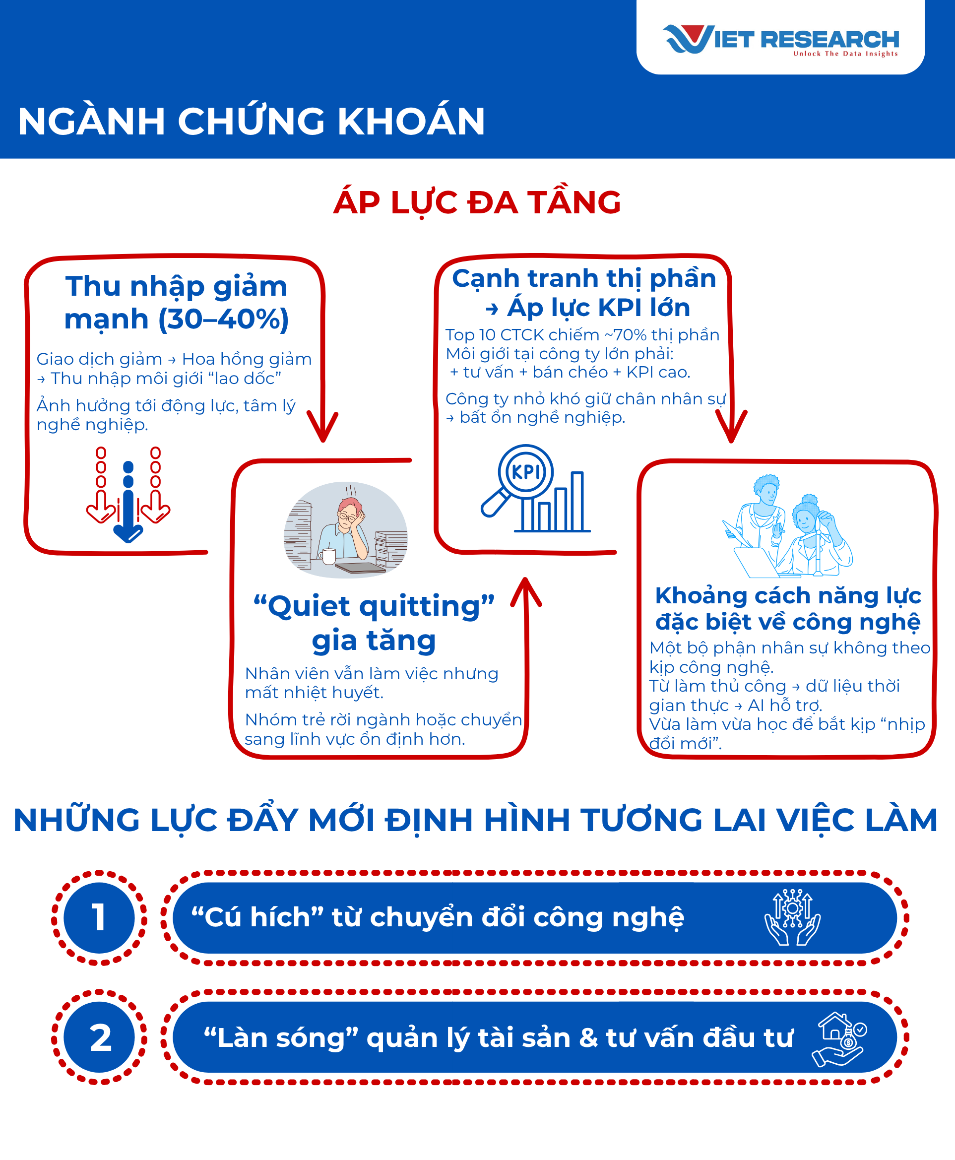 Áp lực lớn nhất và dài hạn nhất đến từ yêu cầu về năng lực công nghệ – điều mà ngành Chứng khoán chưa từng đối diện với tốc độ nhanh đến vậy. Các công ty đua nhau đầu tư nền tảng số, AI, dữ liệu lớn, tự động hóa quy trình; điều này khiến một loạt công việc truyền thống bị thu hẹp hoặc thay thế. Những môi giới quen làm việc theo cảm tính, quen thao tác thủ công, hoặc thiếu kỹ năng công nghệ đang gặp khó khăn trong quá trình chuyển đổi. Ngược lại, nhóm nhân sự có khả năng đọc hiểu dữ liệu, vận hành hệ thống, sử dụng AI để tối ưu giao dịch và tư vấn khách hàng lại trở nên nổi bật.