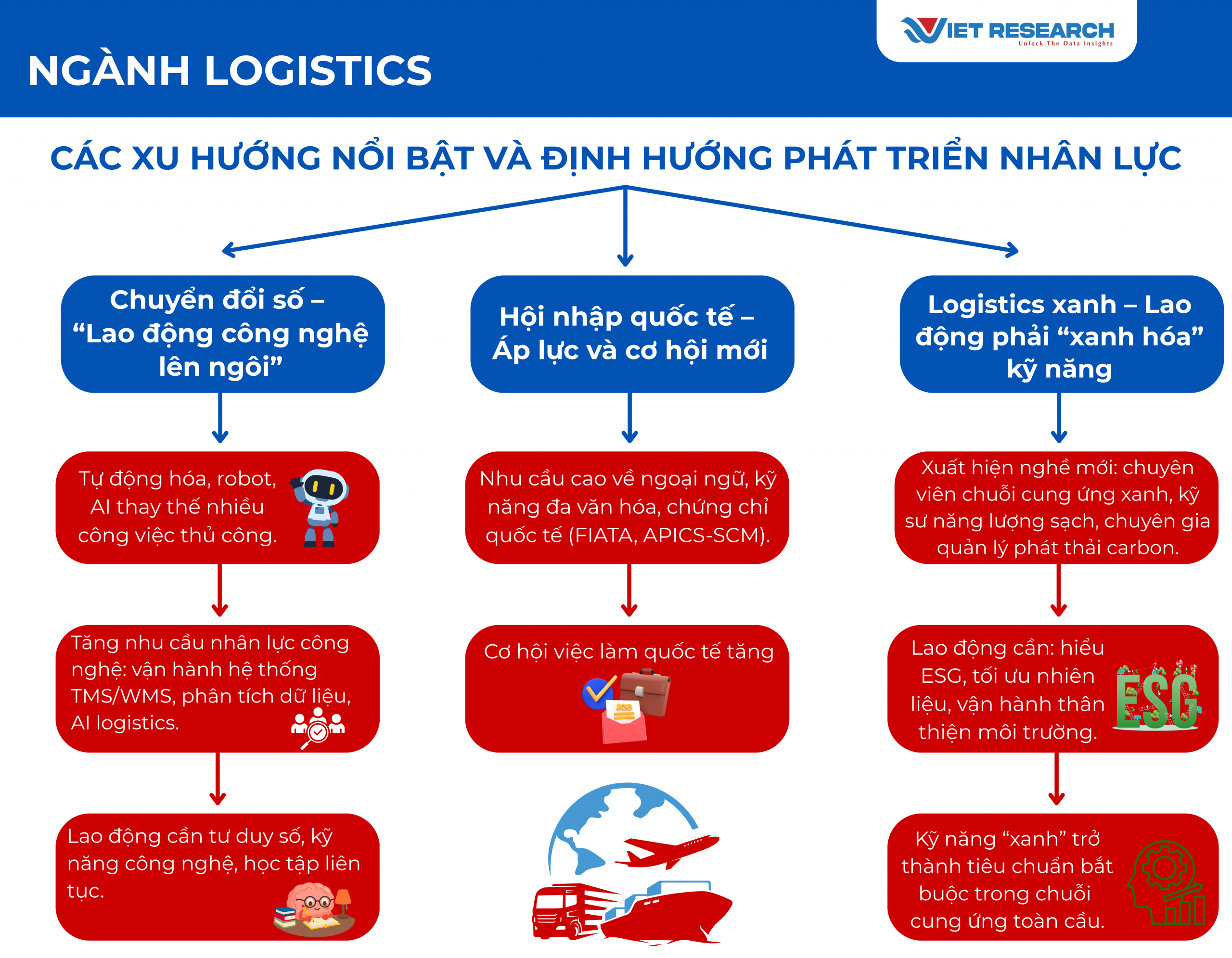 Thứ hai, xu hướng logistics xanh đang mở ra những nghề mới và yêu cầu mới về kỹ năng. Các vị trí như chuyên viên quản lý chuỗi cung ứng xanh, kỹ thuật viên vận hành năng lượng sạch, hay chuyên gia quản lý phát thải carbon đang trở nên phổ biến. Lao động logistics nay phải hiểu về quản lý năng lượng, tối ưu tuyến đường, quy trình vận hành thân thiện môi trường và tuân thủ tiêu chuẩn ESG. Các kỹ năng “xanh” dần trở thành tiêu chí bắt buộc để người lao động có thể làm việc trong chuỗi cung ứng toàn cầu, nơi các tập đoàn yêu cầu đối tác đạt chứng nhận carbon thấp hoặc ISO môi trường.