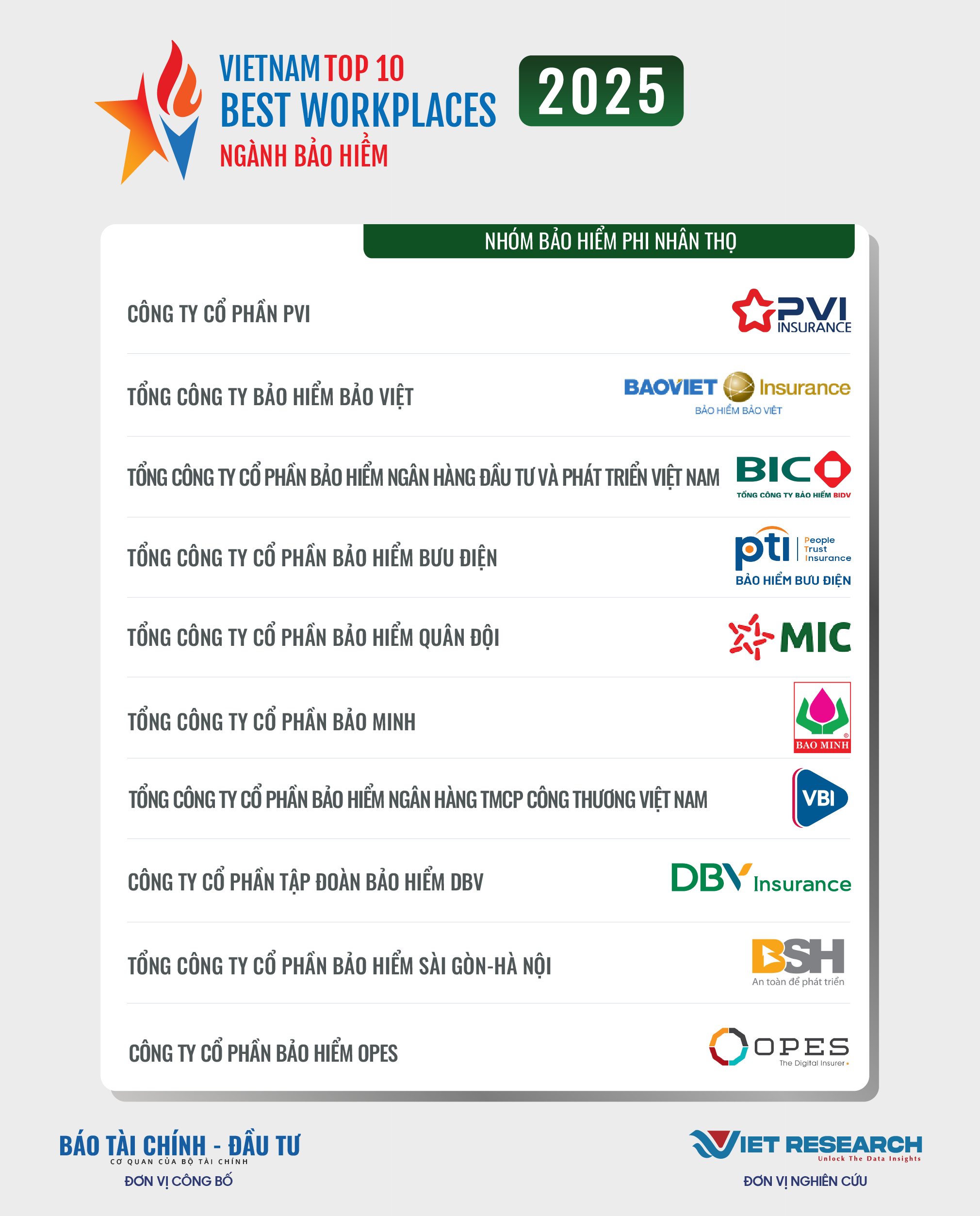 Năm 2025 là năm thứ tư liên tiếp Chương trình Top 10 Nơi làm việc tốt nhất Việt Nam – VBW10 trong các ngành kinh tế trọng điểm được Viet Research và Báo Tài chính – Đầu tư (Bộ Tài chính) nghiên cứu và công bố. Đây là chương trình thường niên nhằm tìm kiếm và tôn vinh những doanh nghiệp có môi trường làm việc tốt nhất trong các ngành, các doanh nghiệp tuyển dụng hàng đầu Việt Nam, những thành tố quan trọng tạo cơ hội việc làm, góp phần chung vào sự phát triển bền vững của đất nước và nền kinh tế trong giai đoạn mới. Những doanh nghiệp xuất sắc góp mặt trong VBW10 đóng vai trò quan trọng trong việc định hình và nâng cao chất lượng thị trường lao động quốc gia, đóng vai trò dẫn dắt trong việc thúc đẩy trách nhiệm xã hội và phát triển bền vững, tạo ra giá trị lâu dài cho các cổ đông, người lao động, nền kinh tế và xã hội.