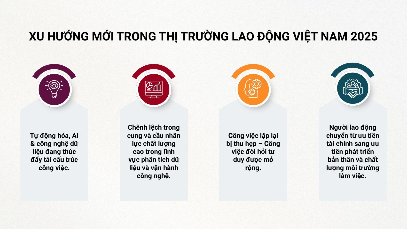 Thị trường lao động Việt Nam năm 2025 chứng kiến nhiều chuyển dịch quan trọng khi kinh tế phục hồi, công nghệ tăng tốc và kỳ vọng của người lao động thay đổi sâu sắc. Dữ liệu từ các doanh nghiệp lớn trong một số ngành trọng điểm như Ngân hàng, Bán lẻ, Xây dựng, hay F&B cho thấy một xu hướng nổi bật: nhu cầu nhân lực chất lượng cao đang tăng nhanh trong khi nguồn cung chưa theo kịp, đặc biệt ở các vị trí đòi hỏi năng lực phân tích dữ liệu, kỹ năng vận hành công nghệ và khả năng thích ứng trong môi trường số.
